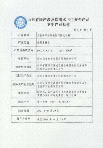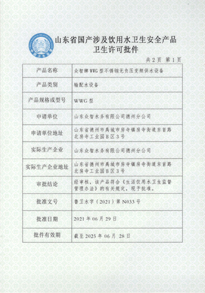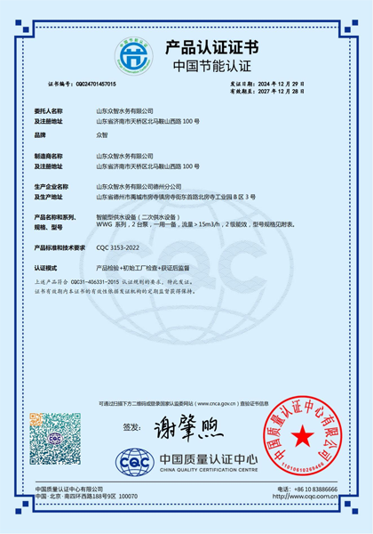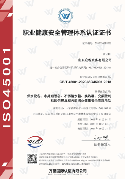 山東眾智水務有限公司成立于2011年,注冊于山東省濟南市。是一家集科研開發、設計、制造、銷售、安裝、調試服務為一體的綜合性企業,榮獲國家級高新技術企業、科技型中小企業、專精特新中小企業。多年來致力于給排水、暖通設備、水處理設備及行業物聯網的研發和生產。公司具有完善的設計、開發、檢測和產品制造能力,通過了三體系認證、CQC國家強制性產品認證、涉及飲用水衛生安全產品衛生許可批件、二次供水設備中國節能產品認證、二級機電安裝資質、AAA級資信等級認證、十二星售后服務認證等多項行業內認證證書。